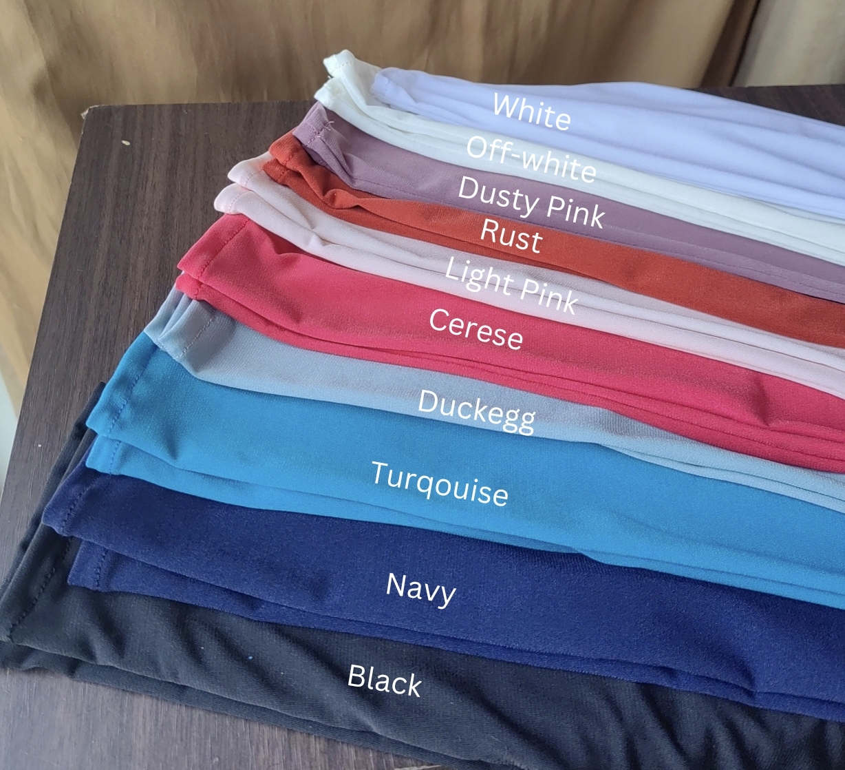 Black, White, Beige, Charcoal, Navy, Light Pink, Duck Egg, Purple, Cream, Red, Rust, turquoise