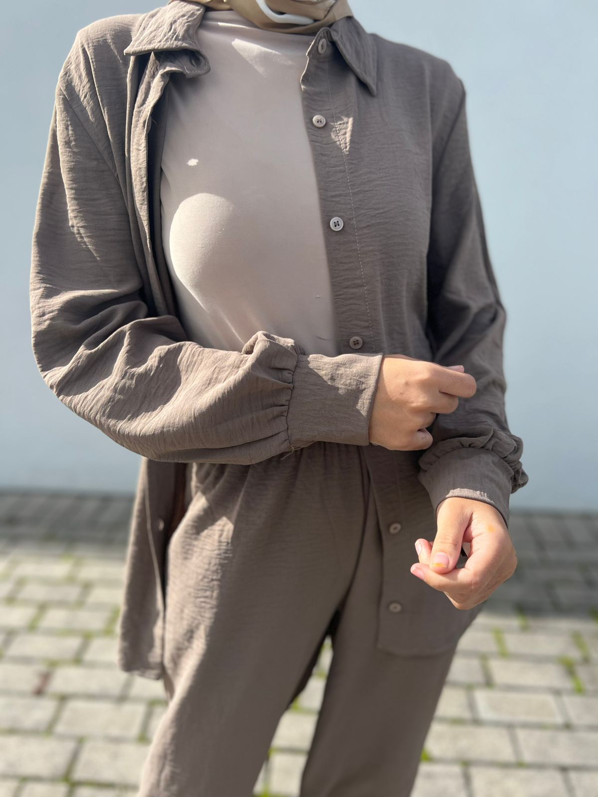 It’s made of crinkle crepe fabric that’s not transparent and has a 5% spandex content, making it stretchy and comfortable. The set includes an elasticated trouser and a button-up oversized shirt. The shirt has lantern-cuffed sleeves and a standard fit.