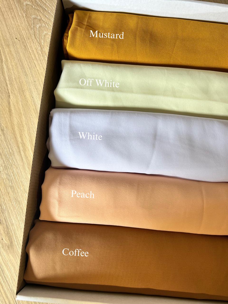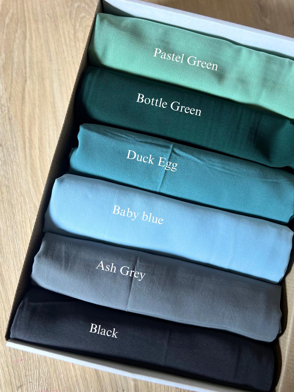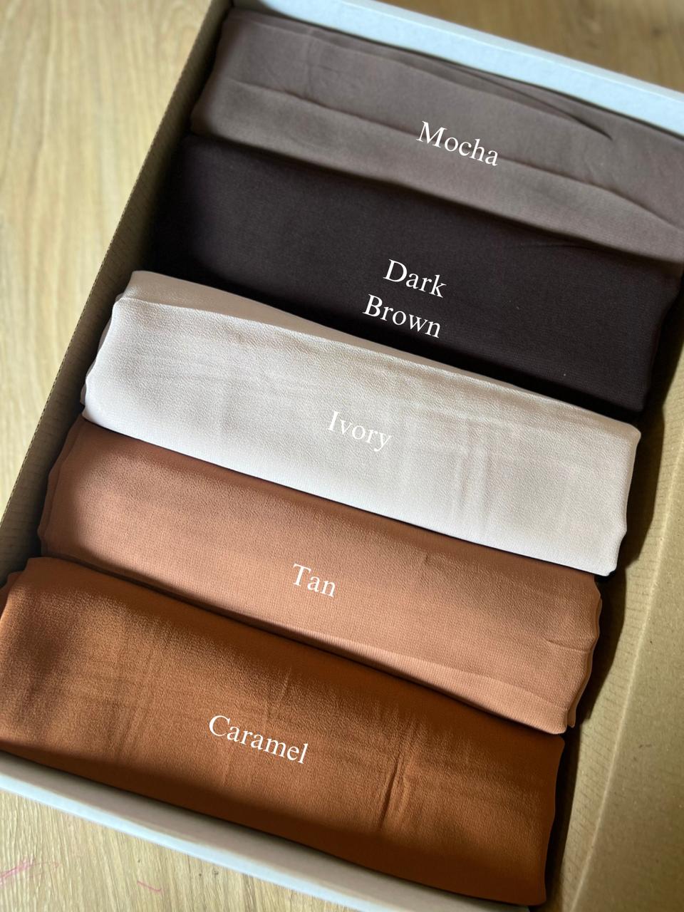 Mocha, Dark Brown, Ivory, Tan, Caramel, Soft pink, Dark Dusty Pink, Dusty Pink, Rose Gold, Baby Pink, Pastel Green, Bottle Green, Duck Egg, Baby Blue, Ash Grey, Black, Mustard, Off White, White, Peach, Coffee